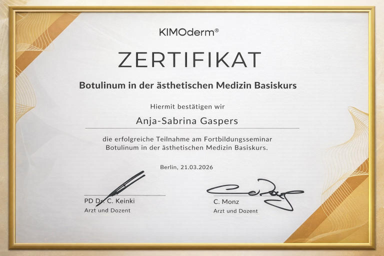 Im Rahmen meiner kontinuierlichen ärztlichen Fortbildung habe ich eine zertifizierte Weiterbildung zur Anwendung von Botulinumtoxin absolviert. Diese ermöglicht es mir, moderne und sichere Behandlungen im ästhetischen Bereich nach aktuellen medizinischen Standards anzubieten.